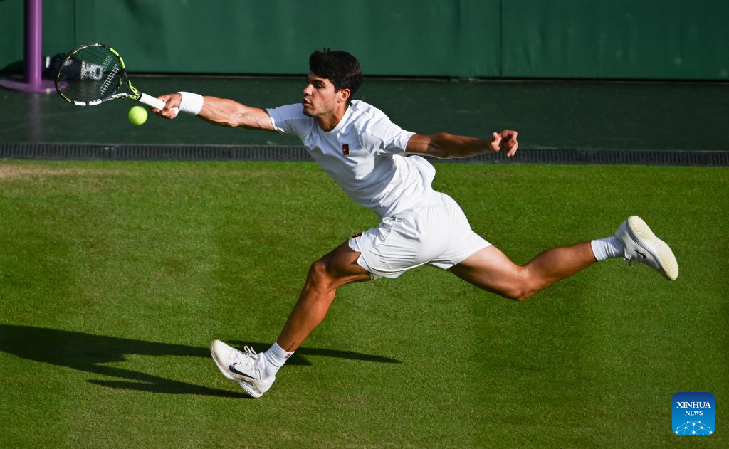 Carlos Alcaraz hits a return during the men's singles final between Carlos Alcaraz of Spain and Jannik Sinner of Italy at the Wimbledon Tennis Championships in London, Britain, July 13, 2025. (Xinhua/Li Ying)