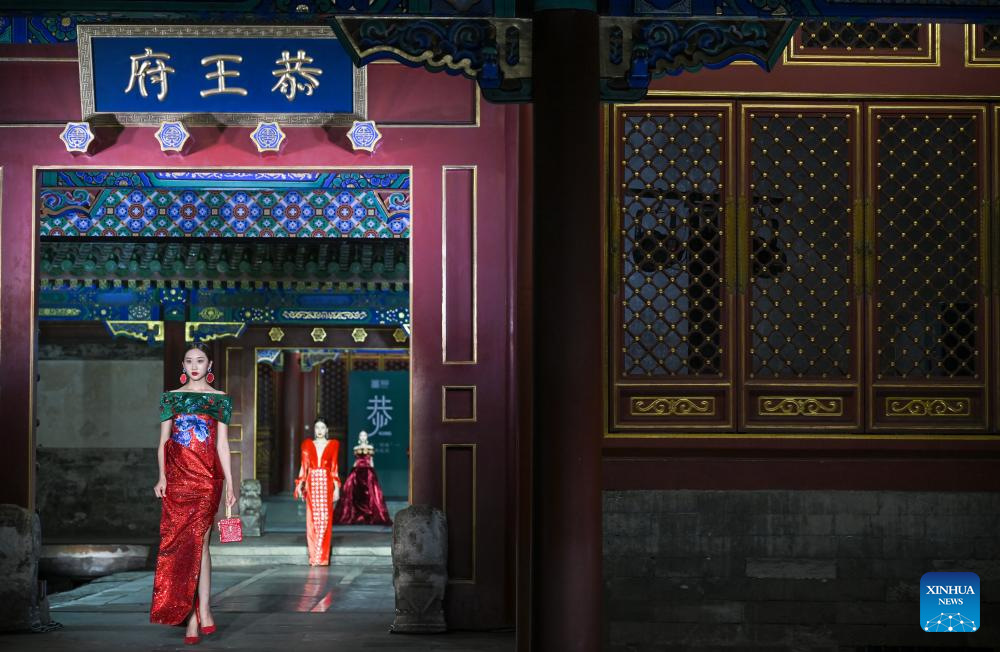 Models present neo-Chinese ready-to-wear designs during a fashion show held at the Prince Kung's Palace Museum in Beijing, capital of China, July 14, 2025. The fashion show is inspired by elements of the Prince Kung's Palace Museum and Chinese intangible cultural heritages, displaying 37 concept creations as well as 35 neo-Chinese ready-to-wear and accessories. (Xinhua/Jin Liangkuai)
