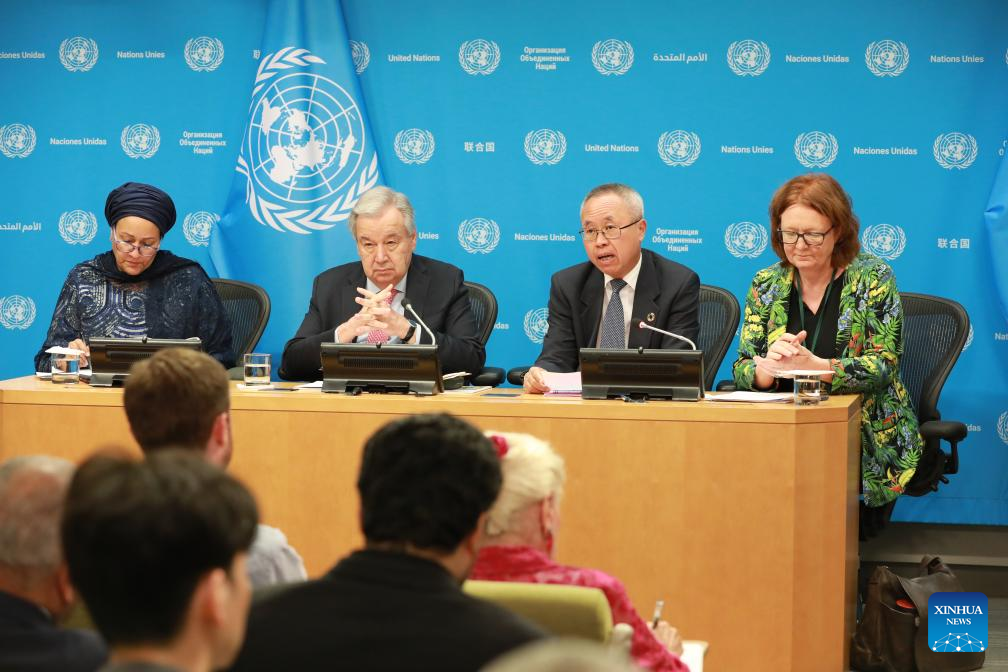 UN Secretary-General Antonio Guterres (C) speaks at the launch of the Sustainable Development Goals Report 2025 at the UN headquarters in New York, on July 14, 2025. With only five years to go, merely 35 percent of the targets of the Sustainable Development Goals (SDGs) are on track, while nearly half are stalling and 18 percent have regressed, according to a UN report released on Monday. (Xinhua/Xie E)