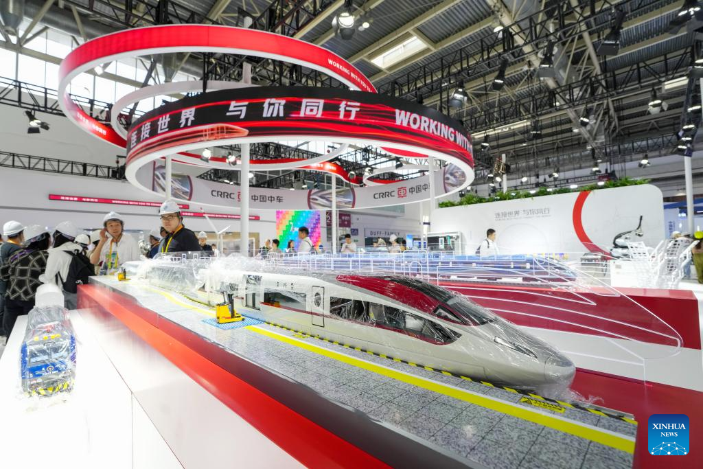 This photo taken on July 14, 2025 shows the booth of CRRC at the advanced manufacturing section of the upcoming third China International Supply Chain Expo (CISCE) in Beijing, capital of China. The third China International Supply Chain Expo (CISCE), scheduled on July 16-20 in Beijing, is expected to focus on supply chains of advanced manufacturing, clean energy, smart vehicles, digital technology, healthy life and green agriculture. (Xinhua/Ju Huanzong)