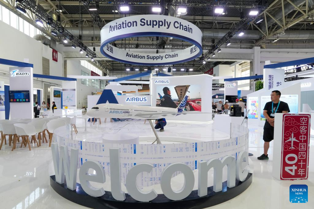 This photo taken on July 14, 2025 shows the booth of aviation supply chain at the advanced manufacturing section of the upcoming third China International Supply Chain Expo (CISCE) in Beijing, capital of China. The third China International Supply Chain Expo (CISCE), scheduled on July 16-20 in Beijing, is expected to focus on supply chains of advanced manufacturing, clean energy, smart vehicles, digital technology, healthy life and green agriculture. (Xinhua/Ju Huanzong)