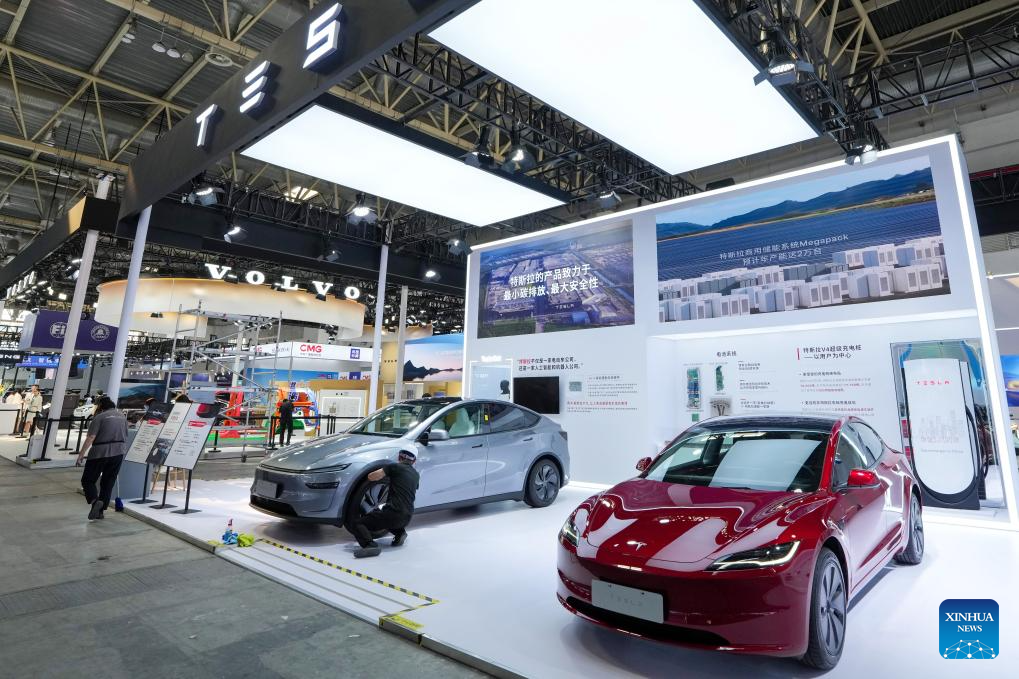 This photo taken on July 14, 2025 shows the booth of Tesla at the smart vehicles section of the upcoming third China International Supply Chain Expo (CISCE) in Beijing, capital of China. The third China International Supply Chain Expo (CISCE), scheduled on July 16-20 in Beijing, is expected to focus on supply chains of advanced manufacturing, clean energy, smart vehicles, digital technology, healthy life and green agriculture. (Xinhua/Ju Huanzong)