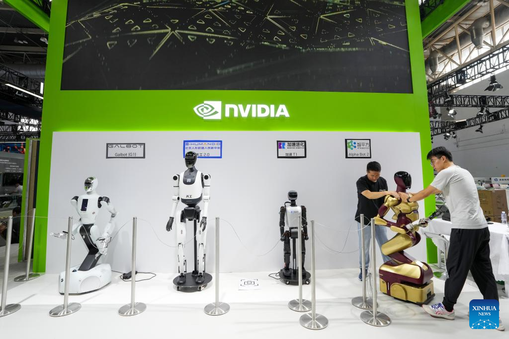 Staff members work at the booth of Nvidia at the digital technology section of the upcoming third China International Supply Chain Expo (CISCE) in Beijing, capital of China, July 14, 2025. The third China International Supply Chain Expo (CISCE), scheduled on July 16-20 in Beijing, is expected to focus on supply chains of advanced manufacturing, clean energy, smart vehicles, digital technology, healthy life and green agriculture. (Xinhua/Ju Huanzong)