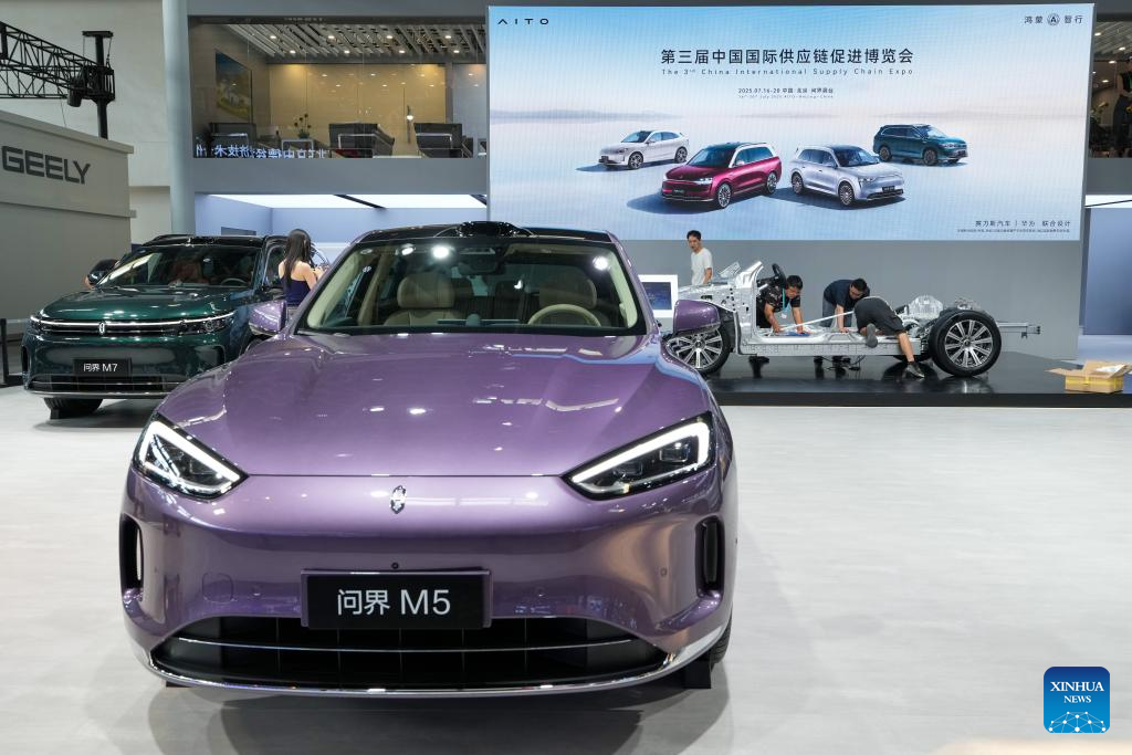 This photo taken on July 14, 2025 shows an AITO M5 vehicle at the smart vehicles section of the upcoming third China International Supply Chain Expo (CISCE) in Beijing, capital of China. The third China International Supply Chain Expo (CISCE), scheduled on July 16-20 in Beijing, is expected to focus on supply chains of advanced manufacturing, clean energy, smart vehicles, digital technology, healthy life and green agriculture. (Xinhua/Ju Huanzong)