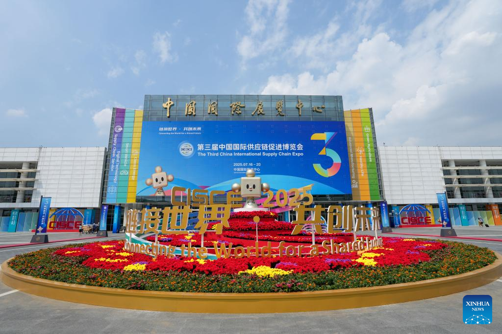 This photo taken on July 14, 2025 shows an exterior view of the venue for the upcoming third China International Supply Chain Expo (CISCE) in Beijing, capital of China. The third China International Supply Chain Expo (CISCE), scheduled on July 16-20 in Beijing, is expected to focus on supply chains of advanced manufacturing, clean energy, smart vehicles, digital technology, healthy life and green agriculture. (Xinhua/Ju Huanzong)