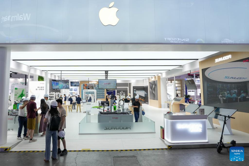 This photo taken on July 14, 2025 shows the booth of Apple at the digital technology section of the upcoming third China International Supply Chain Expo (CISCE) in Beijing, capital of China. The third China International Supply Chain Expo (CISCE), scheduled on July 16-20 in Beijing, is expected to focus on supply chains of advanced manufacturing, clean energy, smart vehicles, digital technology, healthy life and green agriculture. (Xinhua/Ju Huanzong)