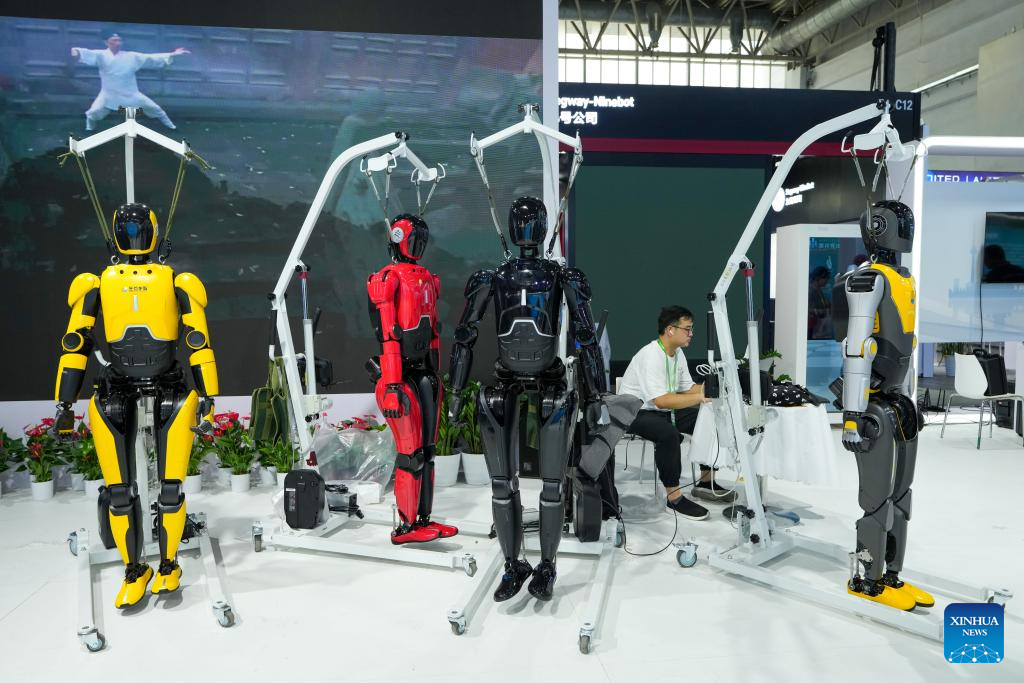 A staff member works at an exhibition area for humanoid robot industrial chain of Hubei Province at the digital technology section of the upcoming third China International Supply Chain Expo (CISCE) in Beijing, capital of China, July 14, 2025. The third China International Supply Chain Expo (CISCE), scheduled on July 16-20 in Beijing, is expected to focus on supply chains of advanced manufacturing, clean energy, smart vehicles, digital technology, healthy life and green agriculture. (Xinhua/Ju Huanzong)