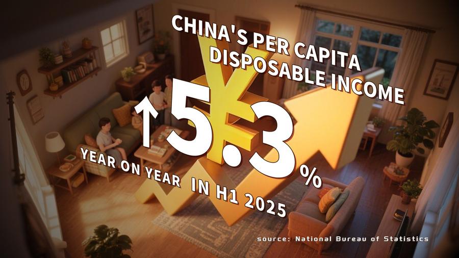 The country's per capita disposable income reached 21,840 yuan during the January-June period, marking a 5.3 percent year-on-year increase in nominal terms, or 5.4 percent after deducting price factors, according to the NBS.