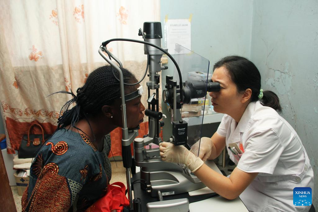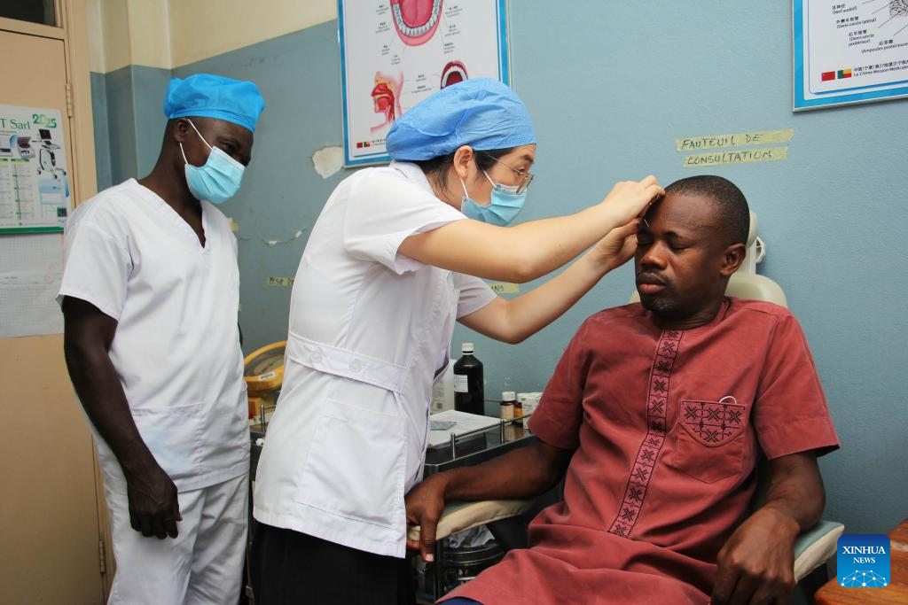 A doctor of the 27th batch of the Chinese medical team to Benin (C) examines a patient at the Mono and Couffo Departmental Hospital Center in Lokossa, Benin, on July 14, 2025. The 27th batch of the Chinese medical team arrived in Benin in January 2024, consisting of 22 members, including 18 medical professionals. They are stationed in Lokossa and Natitingou. Since their arrival, they have provided medical care to 15,382 patients, performed 2,758 surgeries, and organized 26 visits across Benin to provide locals with free consultation, treatment and, when needed, medication. (Photo by Seraphin Zounyekpe/Xinhua)