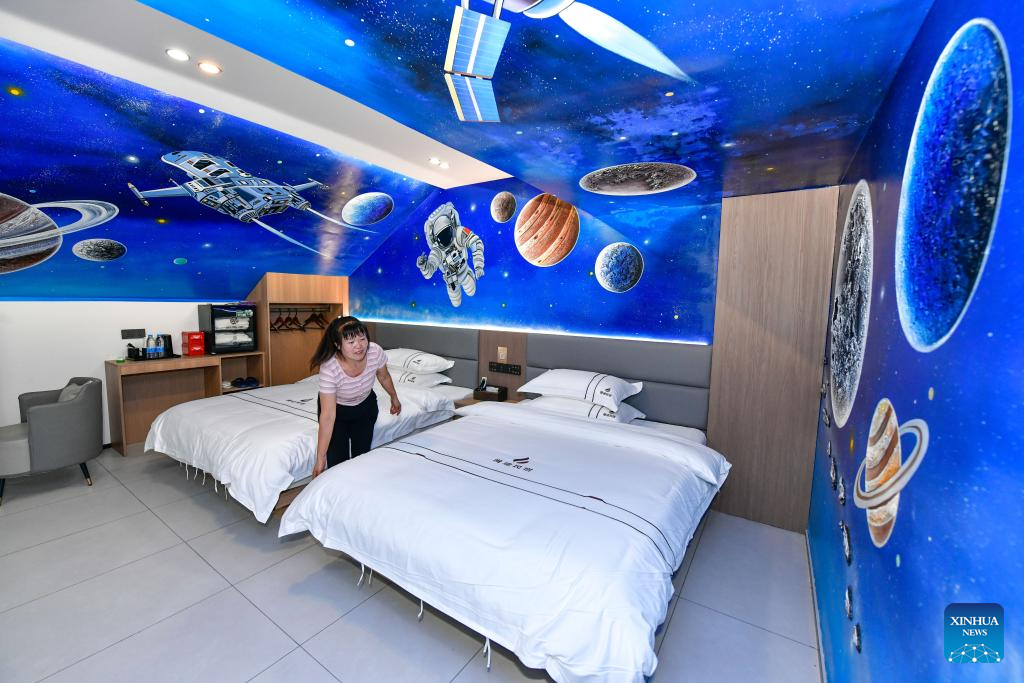 This photo taken on July 9, 2025 shows an owner of a homestay hanging an astronaut-shaped decoration onto the wall at the "Astronomy Town" in Kedu Town, Pingtang County of southwest China's Guizhou Province. (Xinhua/Yang Wenbin)