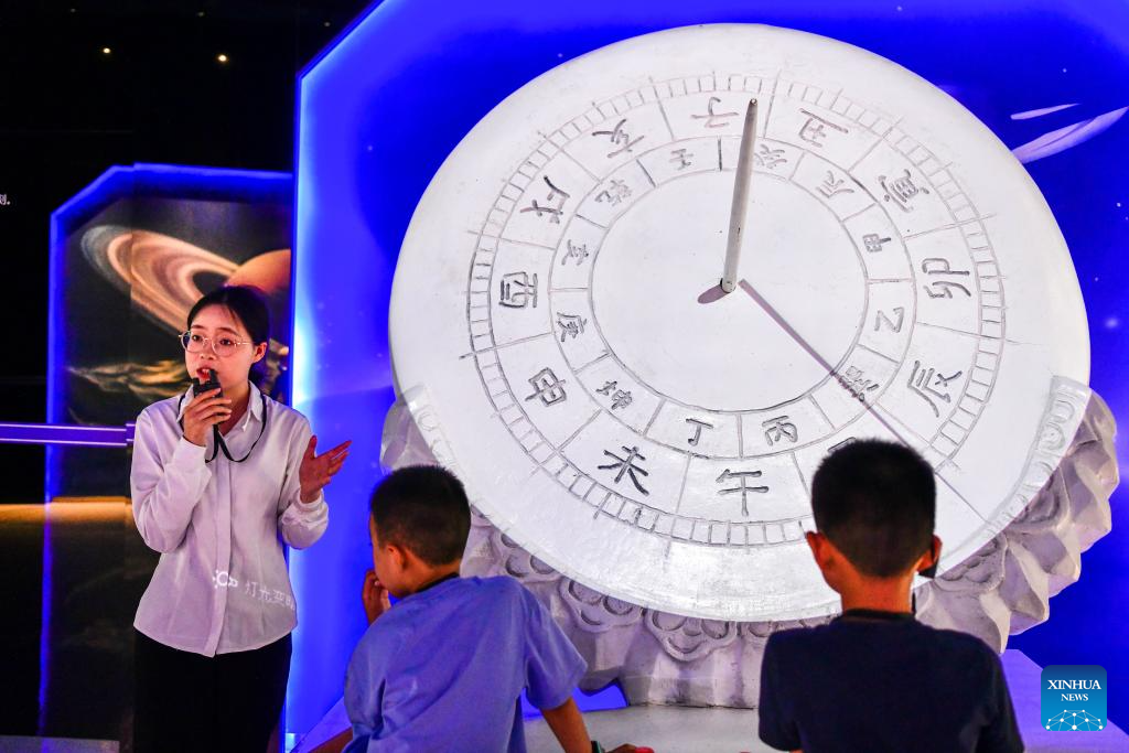 This photo taken on July 10, 2025 shows a staff member explaining an exhibit for visitors at a planetarium in Kedu Town, Pingtang County of southwest China's Guizhou Province. (Xinhua/Yang Wenbin)