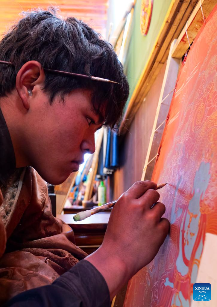 A trainee works on a Thangka painting at a cultural center in Dengqen County, Qamdo, southwest China's Xizang Autonomous Region, Nov. 22, 2024. (Xinhua/Kelsang Namgyai)