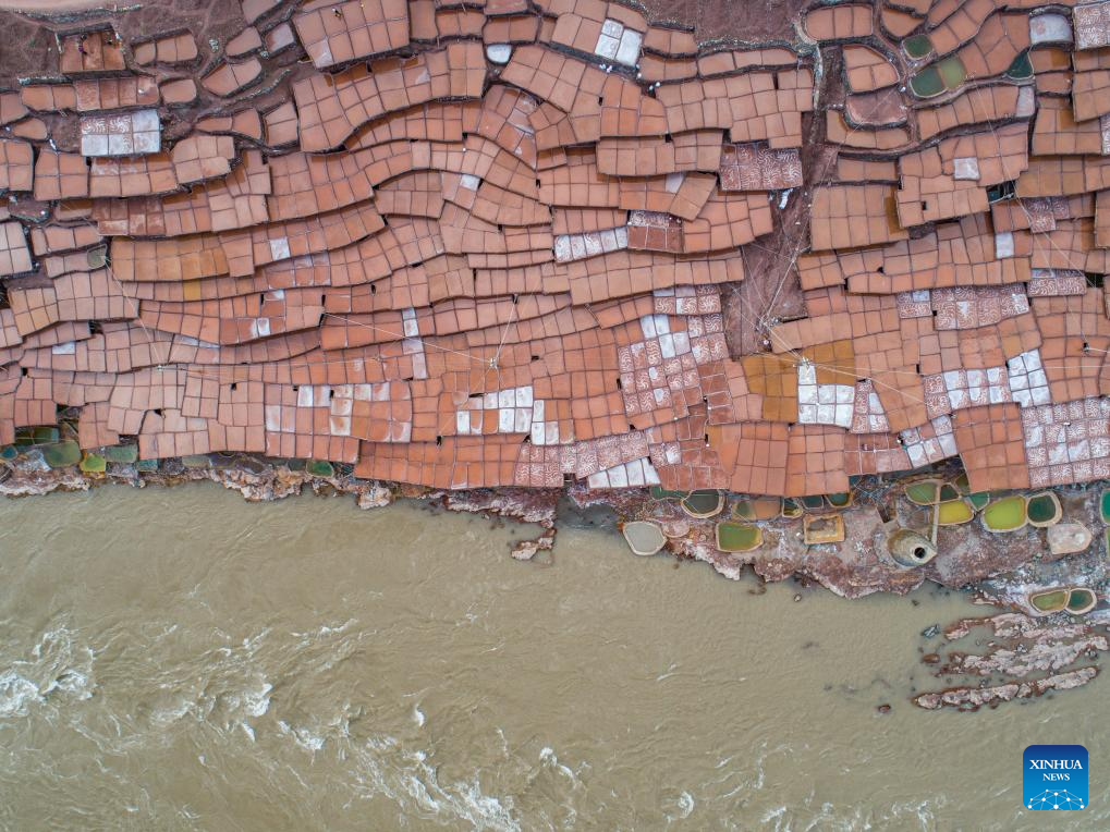 An aerial drone photo taken on Oct. 20, 2023 shows salt fields in Naxi Ethnic Township of Markam County in the city of Qamdo, southwest China's Xizang Autonomous Region. (Xinhua/Sun Fei)