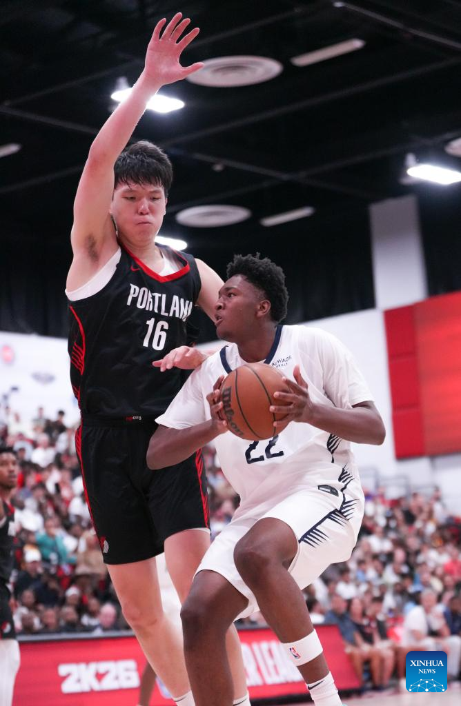 Yang Hansen (L) of Portland Trail Blazers competes during the match between Portland Trail Blazers and New Orleans Pelicans at the 2025 NBA Summer League in Las Vegas, the United States, July 15, 2025. (Photo by Sun Yuxuan/Xinhua)