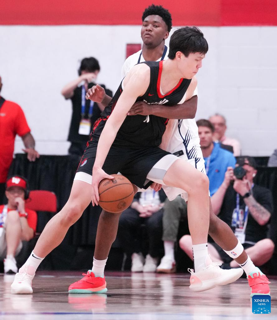 Yang Hansen of Portland Trail Blazers competes during the match between Portland Trail Blazers and New Orleans Pelicans at the 2025 NBA Summer League in Las Vegas, the United States, July 15, 2025. (Photo by Sun Yuxuan/Xinhua)