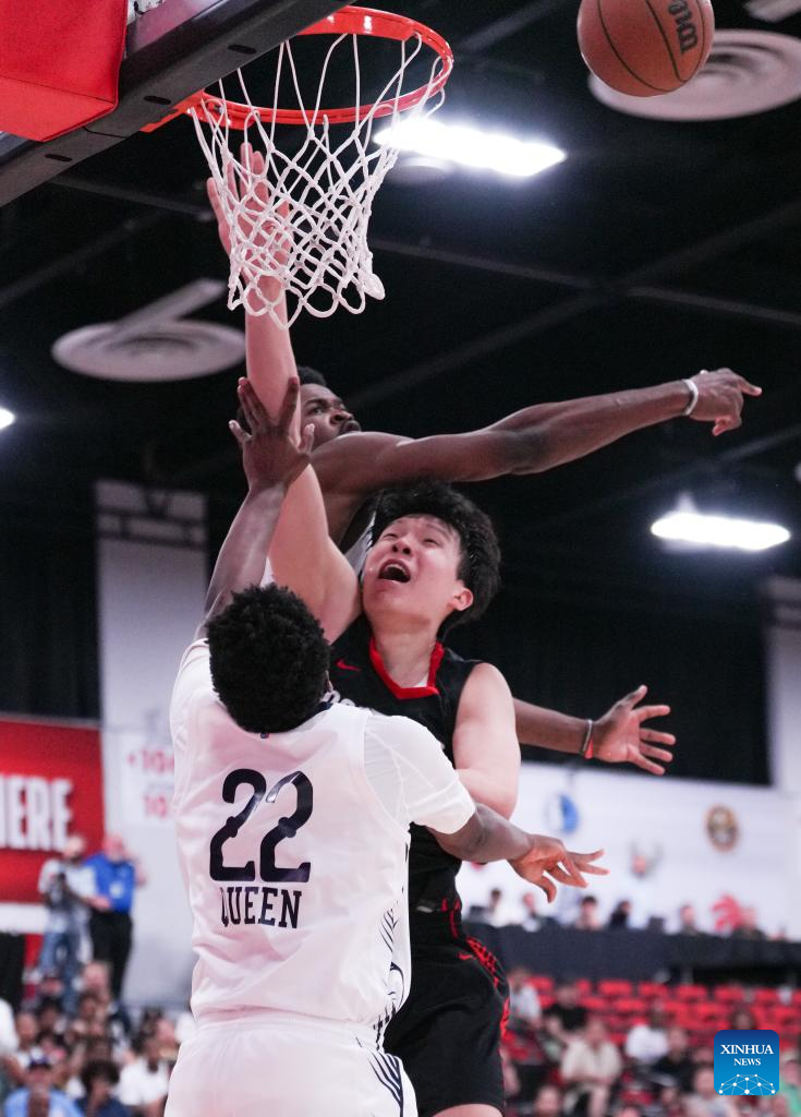 Yang Hansen (L) of Portland Trail Blazers goes for a lay-up during the match between Portland Trail Blazers and New Orleans Pelicans at the 2025 NBA Summer League in Las Vegas, the United States, July 15, 2025. (Photo by Sun Yuxuan/Xinhua)