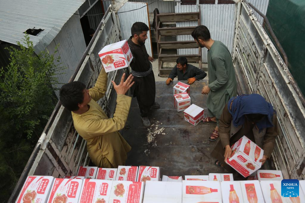 Workers unload expired and low-quality food items in Kabul, the capital of Afghanistan, July 15, 2025. Afghan authorities collected and destroyed 65 tons of expired and low-quality food items in the capital Kabul on Tuesday, officials from the Ministry of Public Health said. (Photo by Saifurahman Safi/Xinhua)