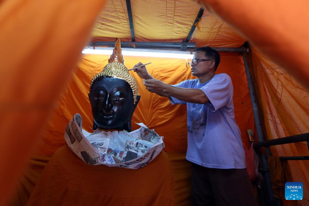 A staff member applies golden paint to a Buddha statue at the Wat Pho temple in Bangkok, Thailand, July 15, 2025.