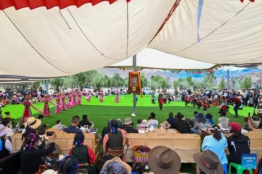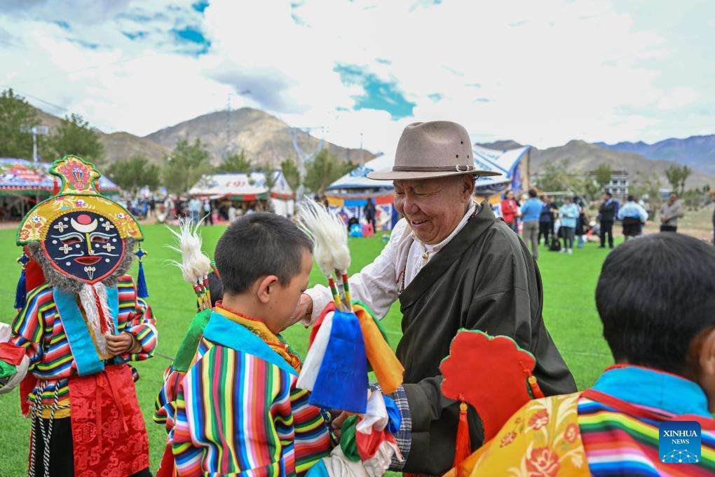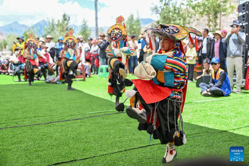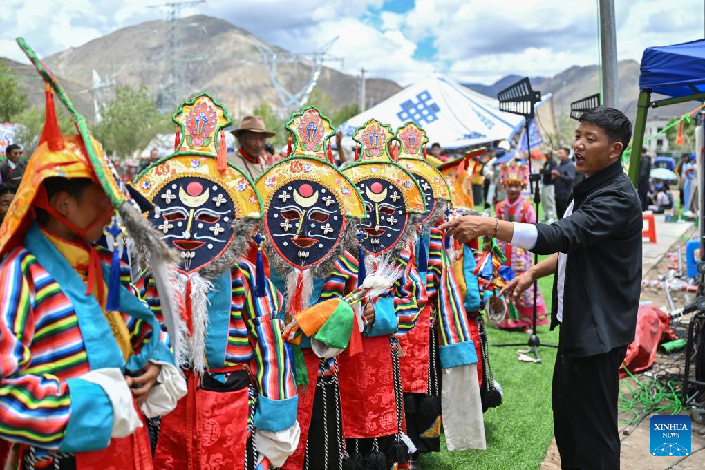 Actors of a folk Tibetan opera troupe perform at a park in Namling County of Xigaze City, southwest China's Xizang Autonomous Region, July 16, 2025. Tibetan opera, an olden art that boasts a history of over six centuries, was listed as a national intangible cultural heritage in 2006. Namling County has stepped up in recent years to further popularize this art by regularly staging plays in the neighborhoods and training more professional performers. To date, the county is home to 29 folk Tibetan opera troupes including 876 practitioners, in addition to a 32-strong children's troupe at an average age of 9. (Xinhua/Li Xin)