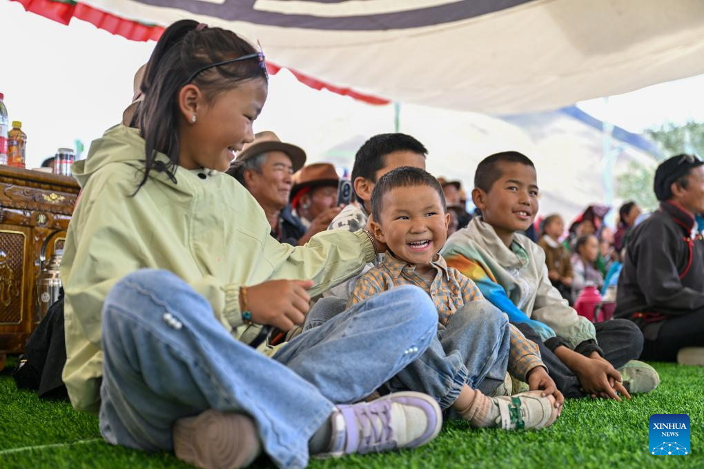 People watch Tibetan opera performance at a park in Namling County of Xigaze City, southwest China's Xizang Autonomous Region, July 16, 2025. Tibetan opera, an olden art that boasts a history of over six centuries, was listed as a national intangible cultural heritage in 2006. Namling County has stepped up in recent years to further popularize this art by regularly staging plays in the neighborhoods and training more professional performers. To date, the county is home to 29 folk Tibetan opera troupes including 876 practitioners, in addition to a 32-strong children's troupe at an average age of 9. (Xinhua/Li Xin)