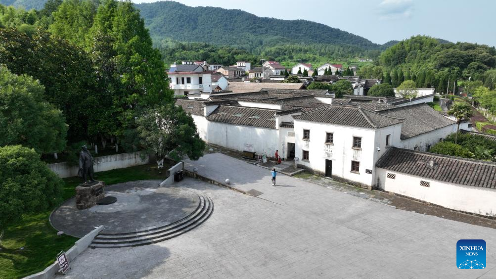 A drone photo taken on July 15, 2025 shows the statue of Ye Ting, commander of the New Fourth Army, and the memorial hall of the former headquarters of the New Fourth Army in Jingxian County, east China's Anhui Province. Located in Yunling Township of Jingxian County in Xuancheng City, the memorial hall covers an area of 20,000 square meters. It is one of the important heritage sites under state protection, and was established based on 11 preserved sites that the New Fourth Army headquarters had been stationed in Yunling from 1938 to 1941, during the Chinese People's War of Resistance Against Japanese Aggression. (Xinhua/Zhou Mu)