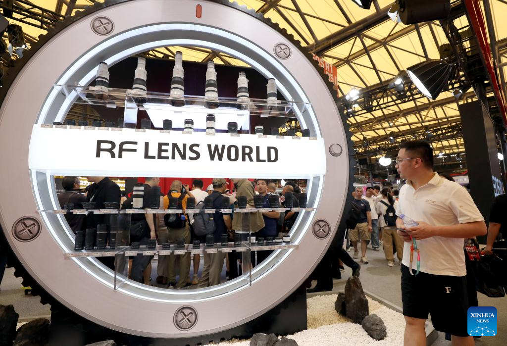 Visitors learn about cameras and lens at a booth during the Photo and Imaging Shanghai 2025 in Shanghai, east China, July 17, 2025. The event, with the participation of over 400 enterprises from the global digital imaging industry, showcases the latest business forms and trends in the visual imaging industry in terms of digital shooting equipment, image output and production technology. (Xinhua/Fang Zhe)