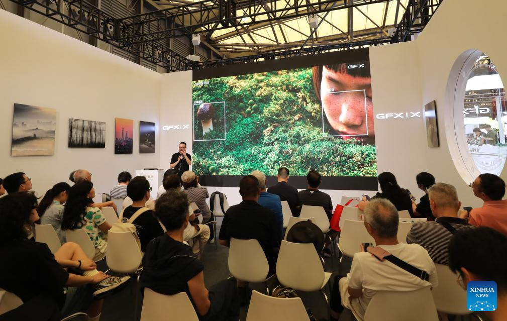 Visitors attend an imaging salon at the Photo and Imaging Shanghai 2025 in Shanghai, east China, July 17, 2025. The event, with the participation of over 400 enterprises from the global digital imaging industry, showcases the latest business forms and trends in the visual imaging industry in terms of digital shooting equipment, image output and production technology. (Xinhua/Fang Zhe)