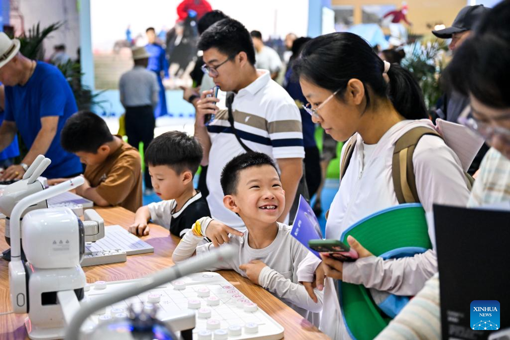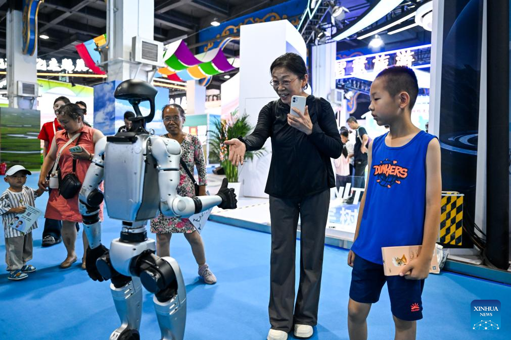 People interact with a robot during the 9th Inner Mongolia Cultural Industry Expo in Hohhot, north China's Inner Mongolia Autonomous Region, July 17, 2025. The expo, with nine exhibition zones, is held in Hohhot from July 17 to 21. (Xinhua/Li Zhipeng)
