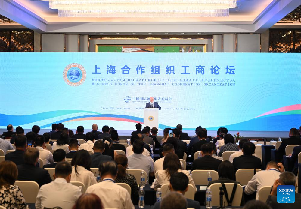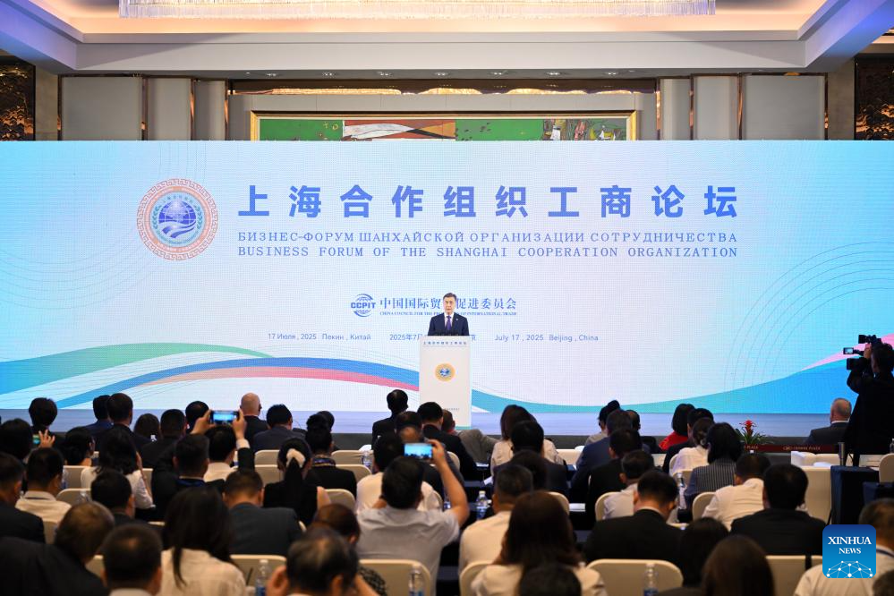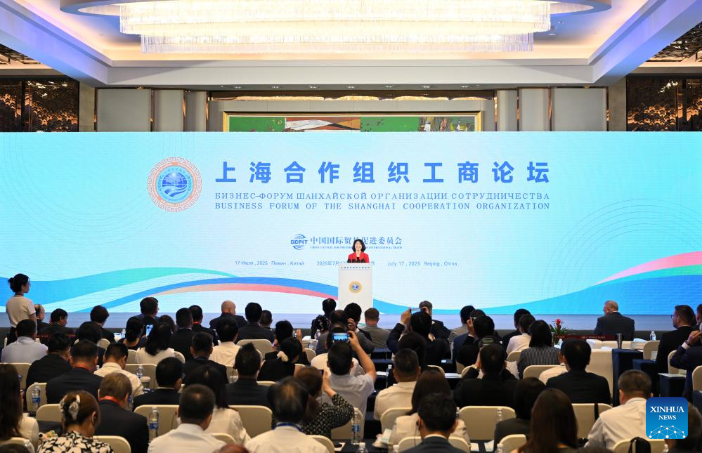 Li Qingshuang, vice chairperson of the China Council for the Promotion of International Trade, chairs the opening ceremony of the Shanghai Cooperation Organization (SCO) business forum in Beijing, capital of China, July 17, 2025. Hosted by the China Council for the Promotion of International Trade, the forum attracted nearly 400 participants from government institutions and the business community both at home and abroad. (Xinhua/Jin Liangkuai)