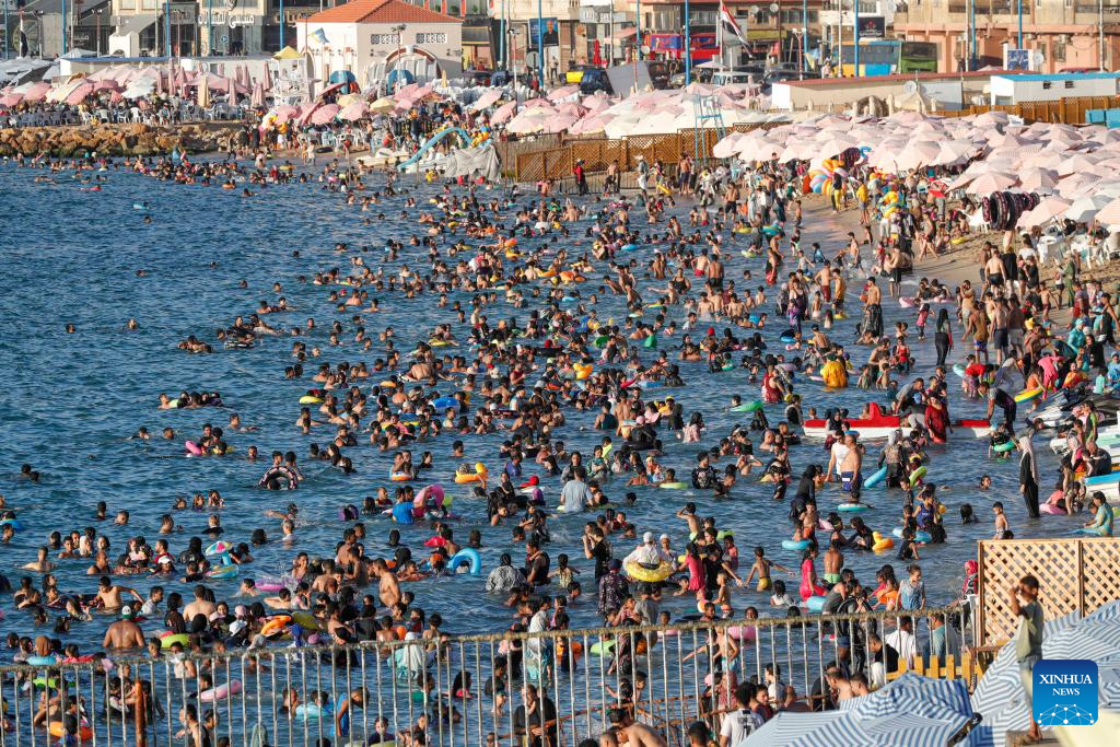 People cool off at a beach of the Mediterranean Sea during a heatwave in Alexandria, Egypt, on July 16, 2025. Egypt is experiencing an exceptional heatwave, with high temperatures and humidity posing significant risks to public health and impacting key sectors such as agriculture and industry. (Xinhua/Ahmed Gomaa)