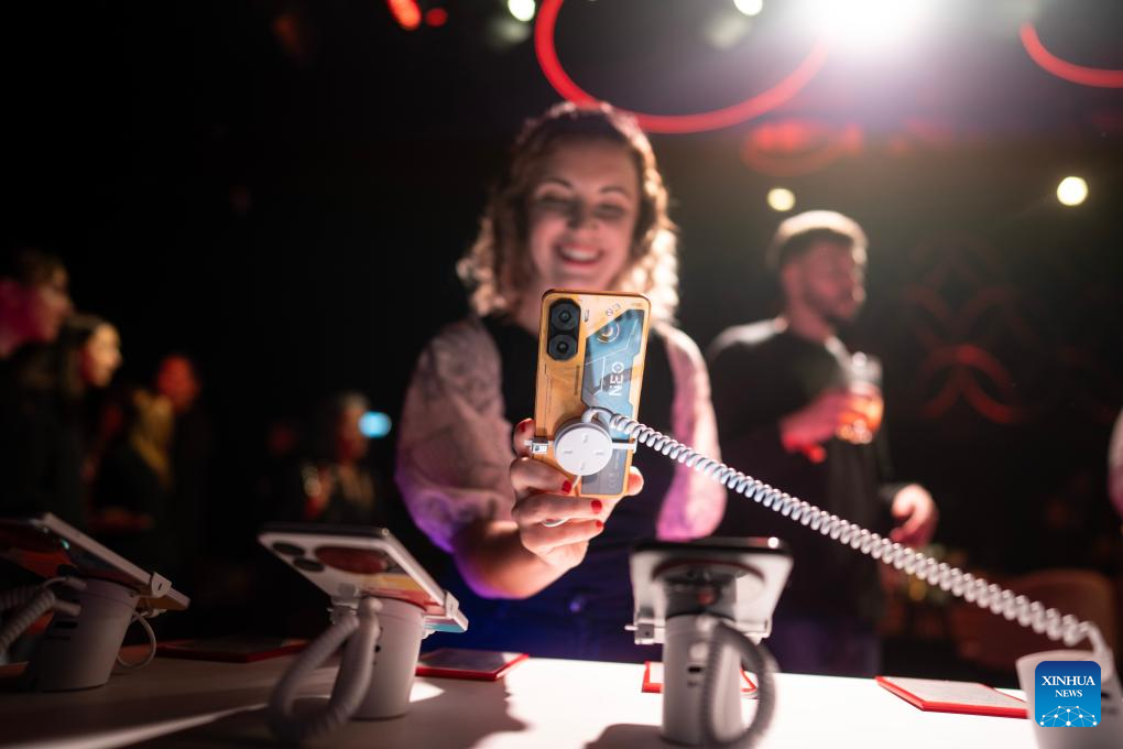 A woman tries out a Nubia smartphone in Buenos Aires, Argentina, on July 15, 2025. Chinese tech company ZTE held a product launch event in Buenos Aires on Tuesday, unveiling 10 new Nubia-branded devices, including smartphones. According to the company, all the new products are assembled in Río Grande, Tierra del Fuego Province, and became available nationwide in Argentina starting July 16. (Photo by Martin Zabala/Xinhua)
