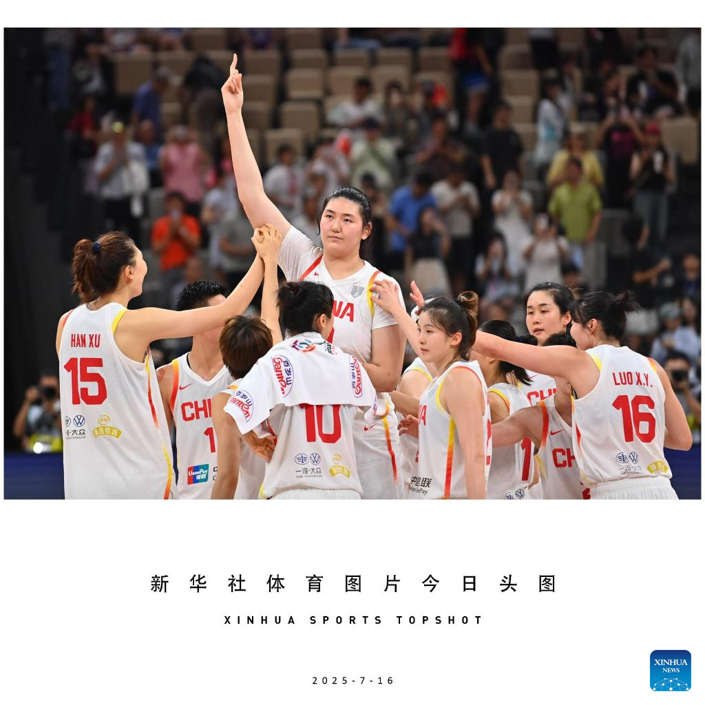 Zhang Ziyu (top) of China celebrate victory with teammates after the Group A match between China and New Zealand at the FIBA Women's Asia Cup Division A 2025 in Shenzhen, south China's Guangdong Province, July 16, 2025. (Xinhua/Xiao Ennan)