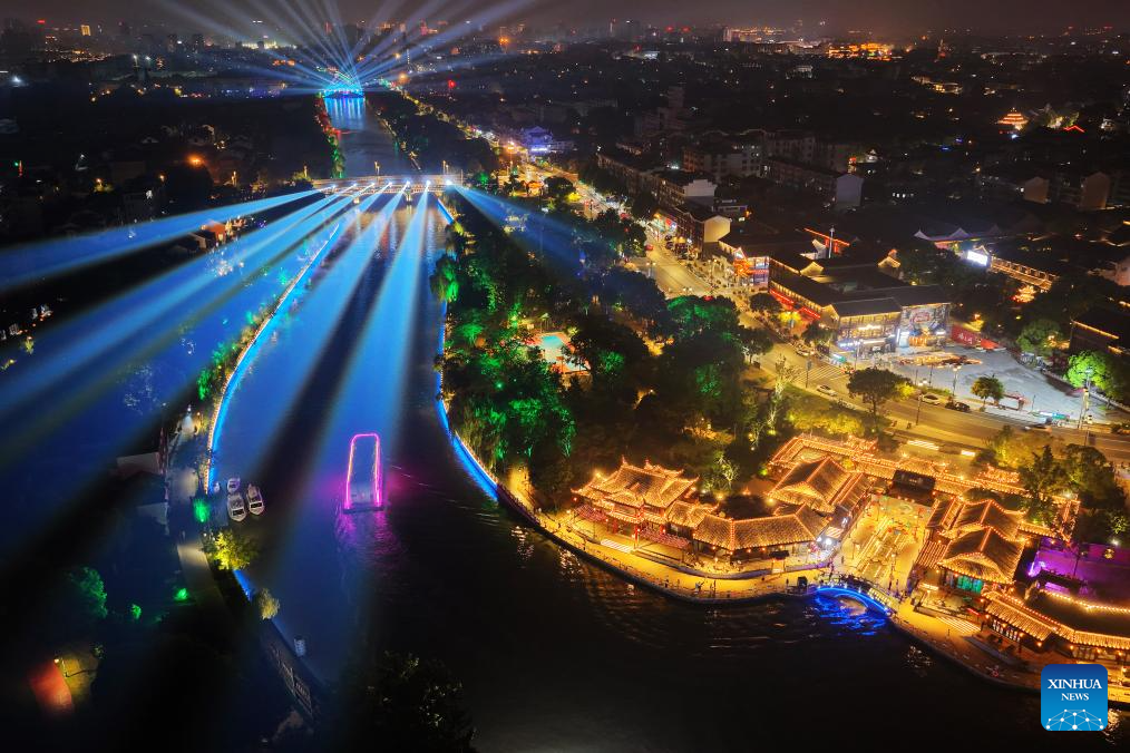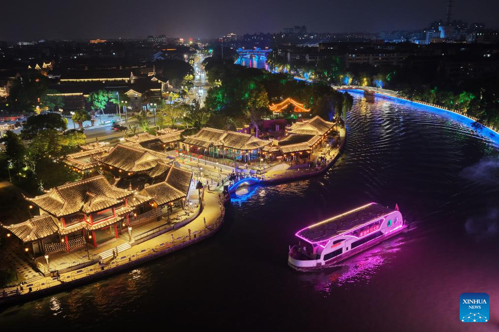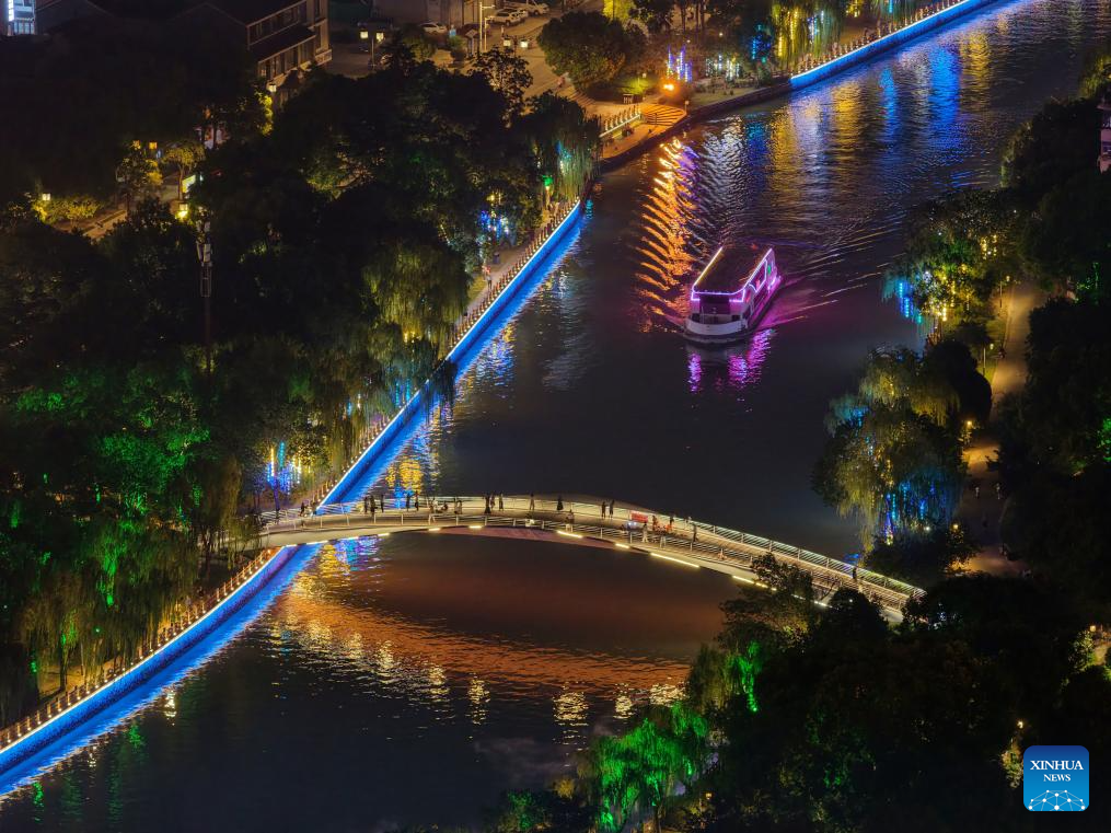 An aerial drone photo shows a night view of the ancient canal in Yangzhou, east China's Jiangsu Province, July 17, 2025. In recent years, Yangzhou has implemented a night landscape upgrade project of the ancient canal, and organized night tours and night markets to improve tourists' consumption experience. (Photo by Meng Delong/Xinhua)