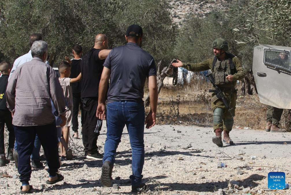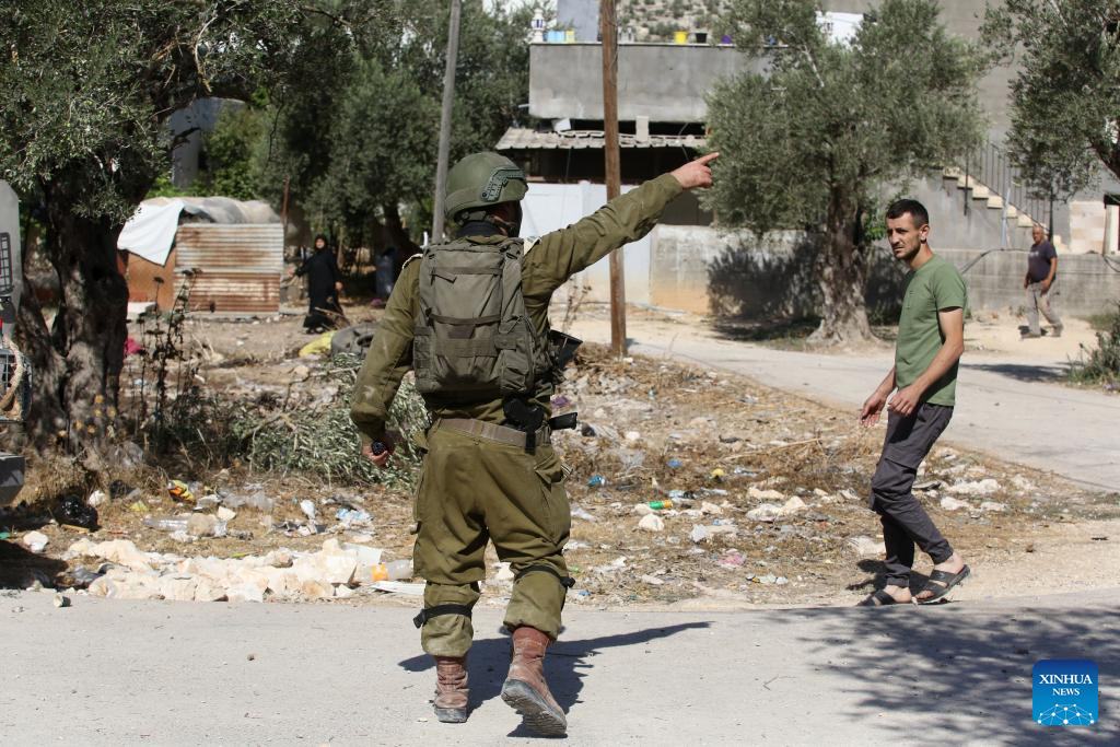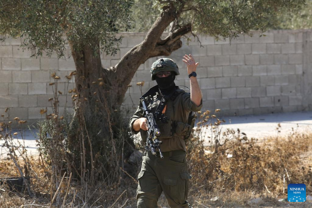 A member of Israeli forces gestures during an operation in Qabatiya town, south of the West Bank city of Jenin, on July 17, 2025. (Photo by Nidal Eshtayeh/Xinhua)