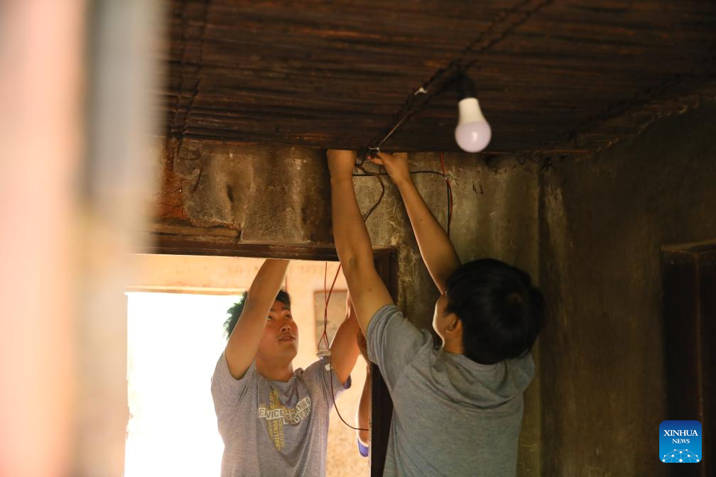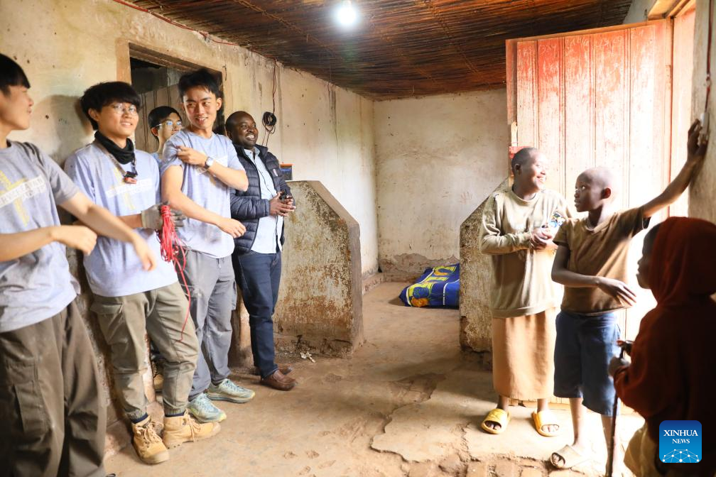 Two students from the Hong Kong Polytechnic University install electrical wiring in a villager's house in Gisagara District, Rwanda, on July 16, 2025. Braving the heat and dust in Rwanda's southern Gisagara District, more than 100 students and teachers from the Hong Kong Polytechnic University (PolyU) recently arrived in rural villages to install solar panels and indoor lighting systems.