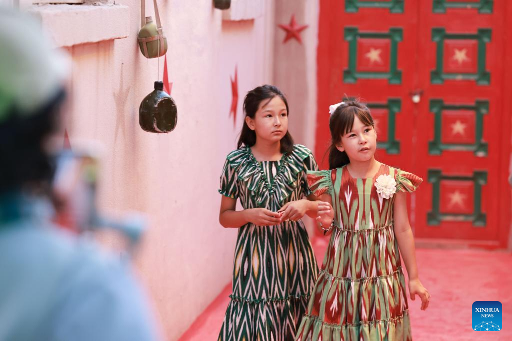 Children enjoy themselves at the Qiuci Alley in Kuqa City, northwest China's Xinjiang Uygur Autonomous Region, on July 17, 2025. Kuqa City in recent years has continuously renovated and upgraded the Qiuci Alley ("Qiuci" is a Chinese pinyin form of Kuqa), which sits at the core area of the city. While retaining the original layout of the historical street, the renovation aimed to improve the habitat environment and enrich tourists' experience. (Xinhua/Meng Tao)