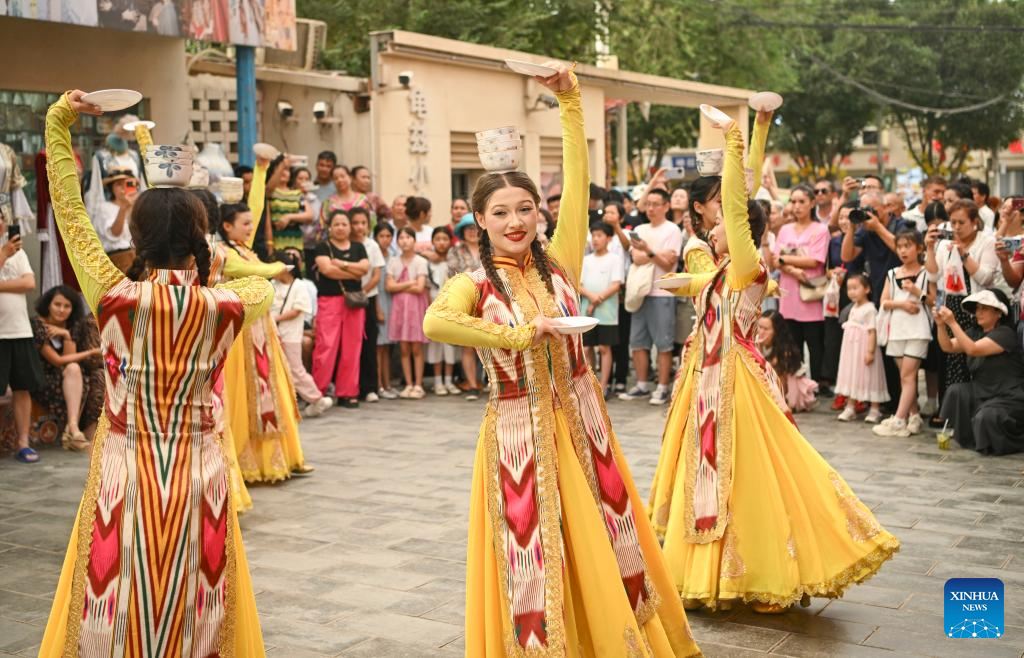Tourists enjoy a bowl dance performance at the Qiuci Alley in Kuqa City, northwest China's Xinjiang Uygur Autonomous Region, on July 17, 2025. Kuqa City in recent years has continuously renovated and upgraded the Qiuci Alley ("Qiuci" is a Chinese pinyin form of Kuqa), which sits at the core area of the city. While retaining the original layout of the historical street, the renovation aimed to improve the habitat environment and enrich tourists' experience. (Xinhua/Zhang Keren)