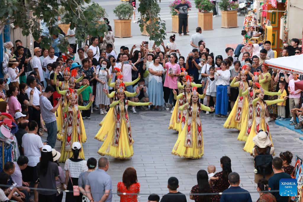 Tourists enjoy a dance performance at the Qiuci Alley in Kuqa City, northwest China's Xinjiang Uygur Autonomous Region, on July 17, 2025. Kuqa City in recent years has continuously renovated and upgraded the Qiuci Alley ("Qiuci" is a Chinese pinyin form of Kuqa), which sits at the core area of the city. While retaining the original layout of the historical street, the renovation aimed to improve the habitat environment and enrich tourists' experience. (Xinhua/Meng Tao)