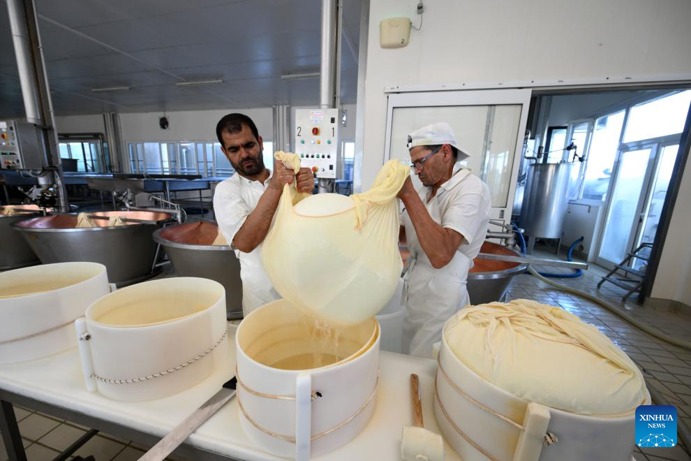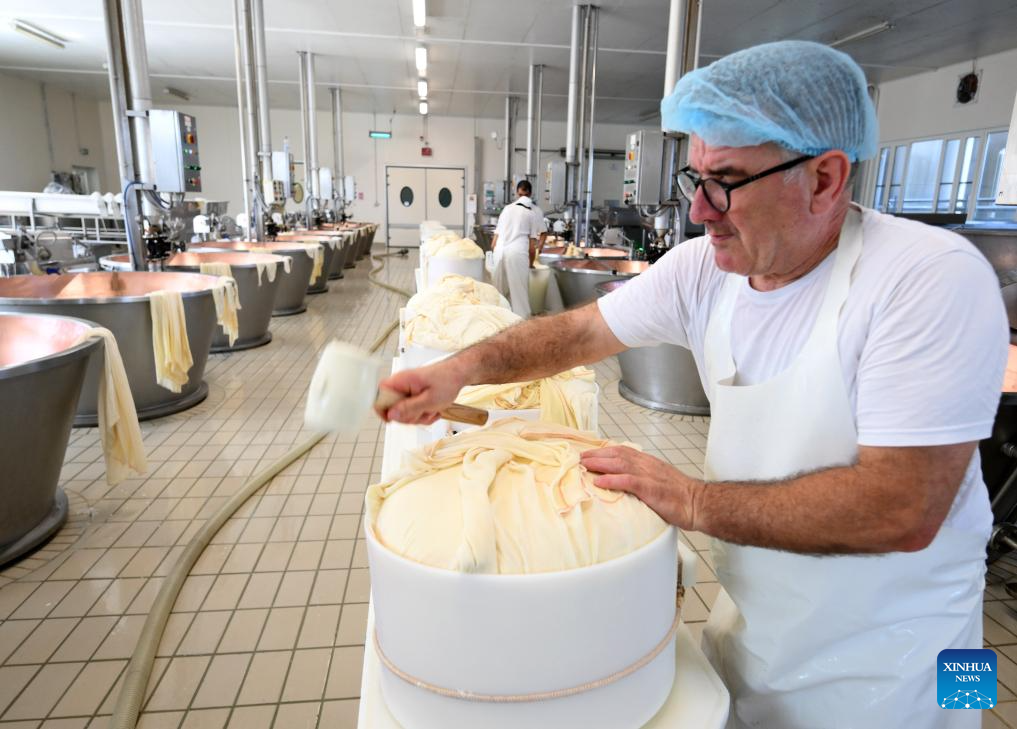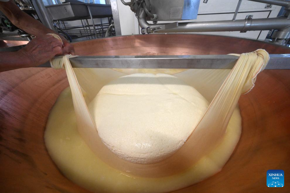 Daniele Dadomo, known as "Casaro," the cheesemaker, works with Parmigiano Reggiano at the Caseificio San Bernardino cheese dairy in Tortiano, Parma, Italy, July 17, 2025. Italy's renowned Parmigiano Reggiano cheese is made from cow's milk and produced exclusively in certain regions of northern Italy. (Photo by Alberto Lingria/Xinhua)