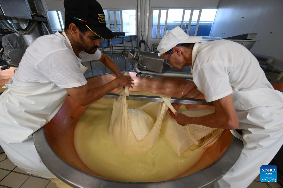 Employees at the Caseificio San Bernardino cheese dairy use a linen cloth to lift the cheese granules during the production of Parmigiano Reggiano at Caseificio San Bernardino, in Tortiano, Parma, Italy, July 17 2025. Italy's renowned Parmigiano Reggiano cheese is made from cow's milk and produced exclusively in certain regions of northern Italy. (Photo by Alberto Lingria/Xinhua)