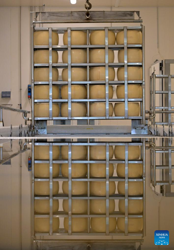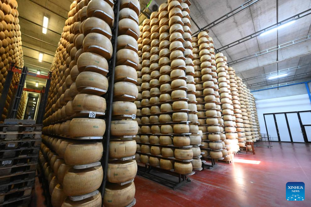 Parmigiano Reggiano cheese wheels are seen at the Caseificio San Bernardino cheese dairy in Tortiano, Parma, Italy, July 17, 2025. Italy's renowned Parmigiano Reggiano cheese is made from cow's milk and produced exclusively in certain regions of northern Italy. (Photo by Alberto Lingria/Xinhua)