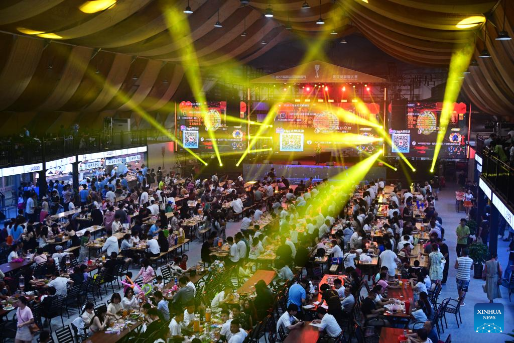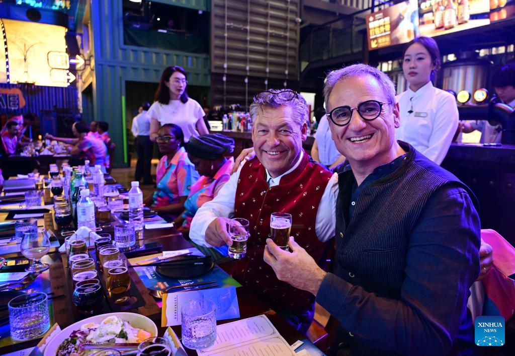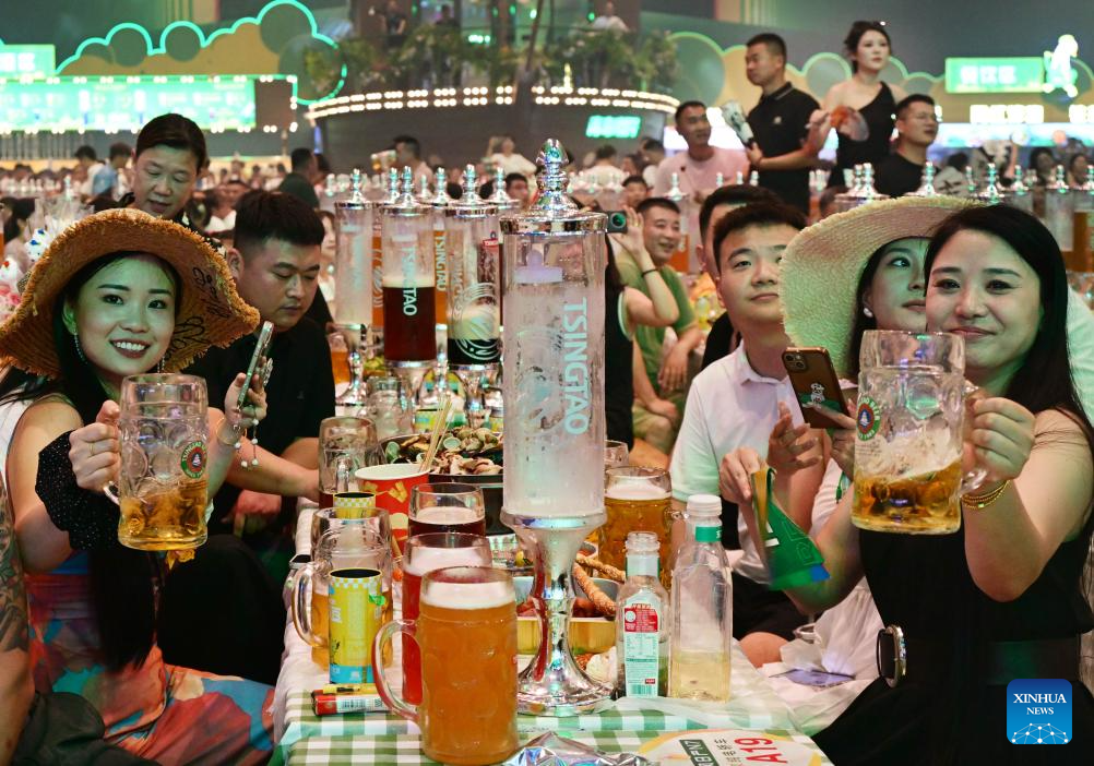 People enjoy beer during the 35th Qingdao International Beer Festival at the Xihai'an (West Coast) New Area in Qingdao, east China's Shandong Province, July 18, 2025. The 30-day festival kicked off here on Friday, gathering over 2,300 domestic and foreign beer brands. The festival also features a series of activities, including art parades, craft beer competition, concerts, King of Beer competition, animation carnival and fashion sports festival. (Xinhua/Li Ziheng)