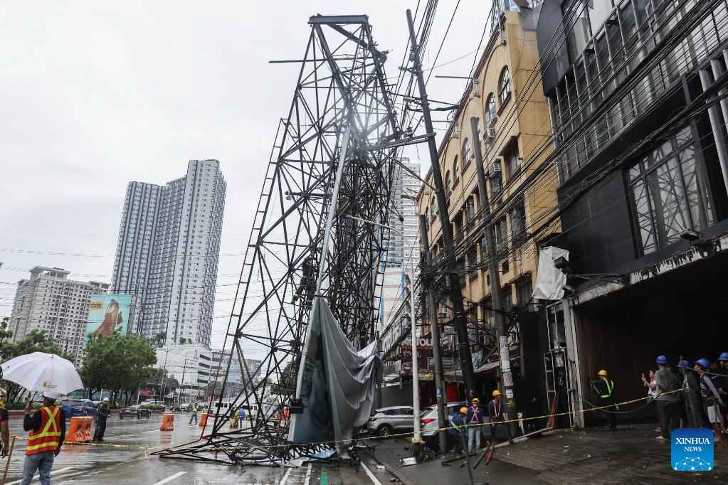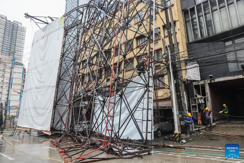 Rescuers work on the site of a billboard collapse due to strong winds in Quezon City, the Philippines, on July 19, 2025. Wipha intensified into a severe tropical storm as it blew away from the Philippines on Saturday, bringing strong winds and heavy rains to many areas. (Xinhua/Rouelle Umali)