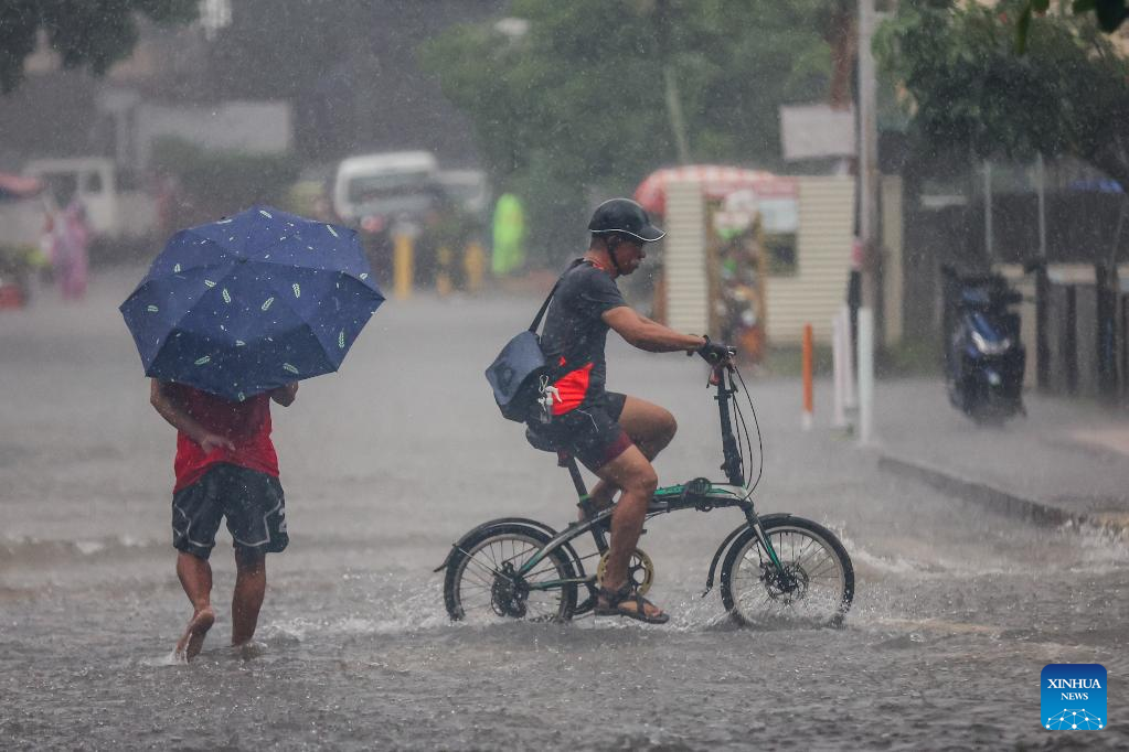 People move through a waterlogged road in Quezon City, the Philippines, on July 19, 2025. Wipha intensified into a severe tropical storm as it blew away from the Philippines on Saturday, bringing strong winds and heavy rains to many areas. (Xinhua/Rouelle Umali)