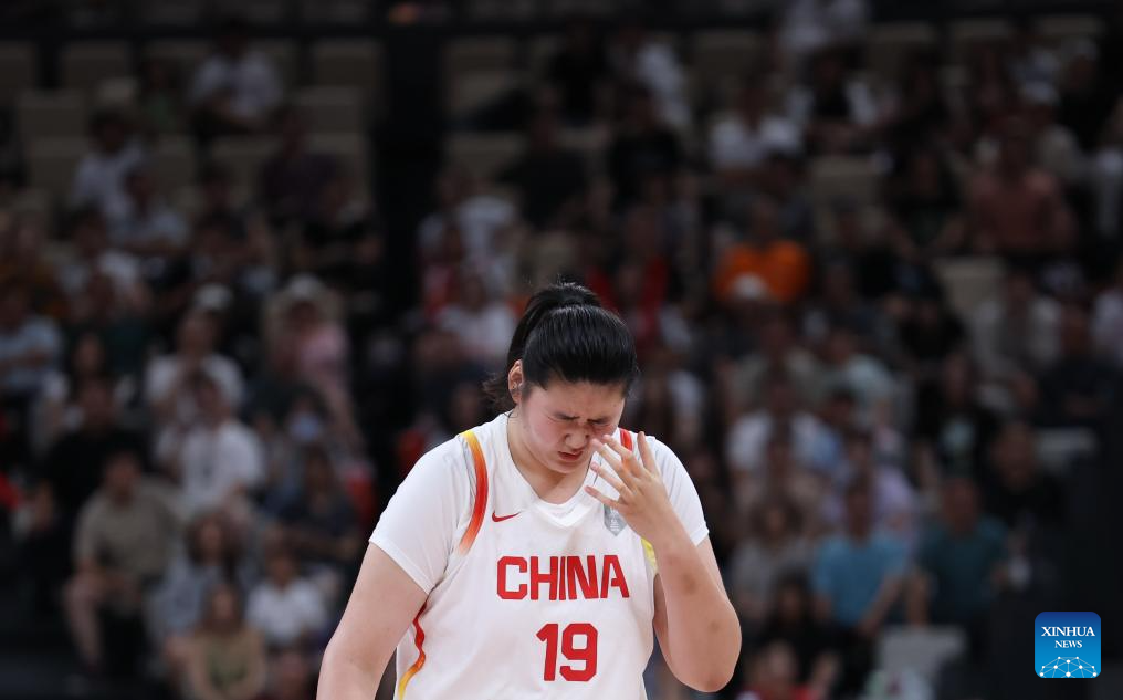 Yang Shuyu (front) of China reacts after the semifinal match between China and Japan at the FIBA Women's Asia Cup 2025 in Shenzhen, south China's Guangdong Province, July 19, 2025. (Xinhua/Mao Siqian)