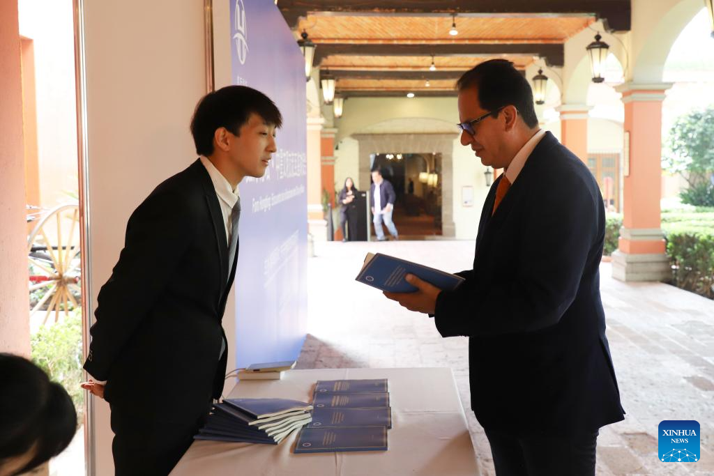 Participants read a think tank report titled "Upholding Cultural Subjectivity Amid the Dynamic Interplay of World Cultures: The Spiritual Cornerstone of China's Path to Modernization" during the "Hongting Forum: Meeting of Civilizations between China and Mexico" in Mexico City, capital of Mexico, July 18, 2025. Xinhua News Agency released the report during the forum on Friday. (Photo by Francisco Canedo/Xinhua)