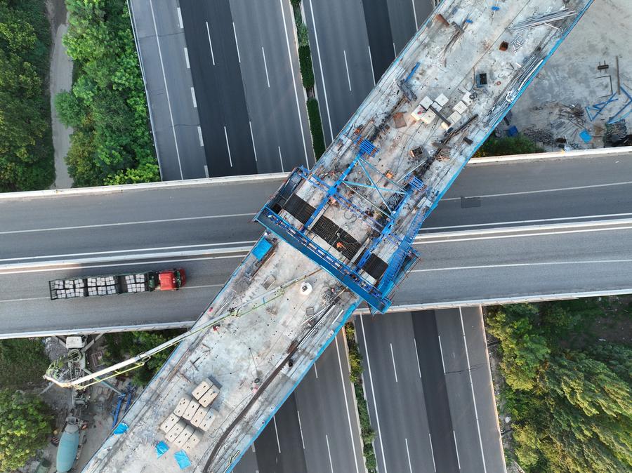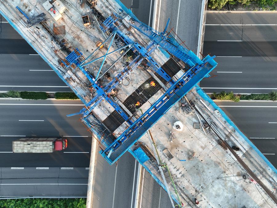 BAODING, July 19 (Xinhua) -- A key segment of the Xiong'an-Xinzhou high-speed railway was completed on Friday. Engineers successfully closed the middle span of a major bridge crossing above the busy Beijing-Hong Kong-Macao Expressway in Baoding, north China's Hebei Province. The section was constructed by China Railway 14th Bureau Group Co., Ltd.