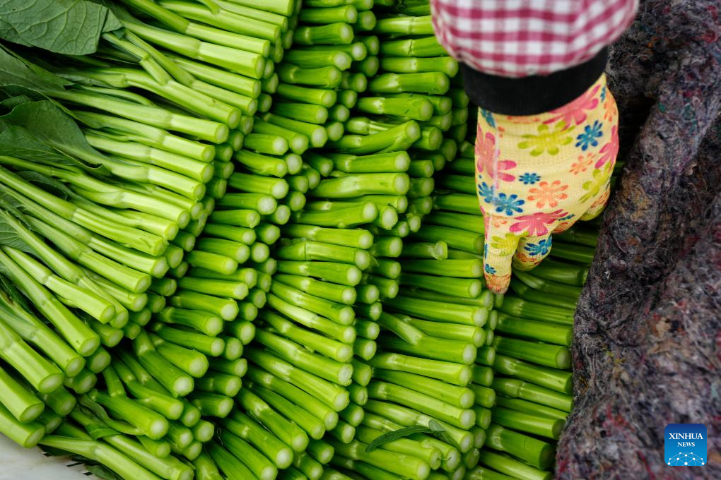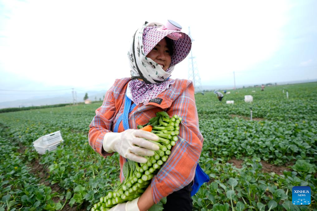 A staff member harvests Chinese flowering cabbages at a cool-season vegetable base in Guyuan, northwest China's Ningxia Hui Autonomous Region, July 18, 2025. Leveraging its high-altitude terrain and cold-weather advantages, Guyuan has vigorously developed its cool-season vegetable industry in recent years. (Xinhua/Wang Peng)