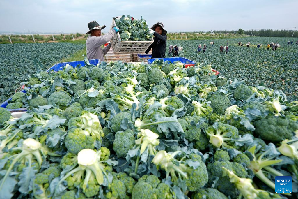 Staff members harvest broccoli at a cool-season vegetable base in Guyuan, northwest China's Ningxia Hui Autonomous Region, July 18, 2025. Leveraging its high-altitude terrain and cold-weather advantages, Guyuan has vigorously developed its cool-season vegetable industry in recent years. (Xinhua/Wang Peng)