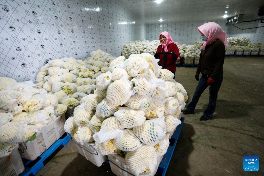 Staff members transport cauliflower at a cool-season vegetable base in Guyuan, northwest China's Ningxia Hui Autonomous Region, July 18, 2025. Leveraging its high-altitude terrain and cold-weather advantages, Guyuan has vigorously developed its cool-season vegetable industry in recent years. (Xinhua/Wang Peng)